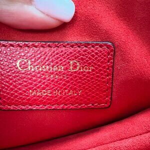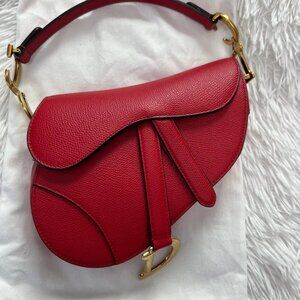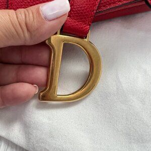 100% authentic CHRISTIAN DIOR Grained Calfskin Mini Saddle Bag in red. This bag features the saddle bag shape, with a polished brass "C" and "D" anchors on either end of the handle for handle and a prominent hanging Dior "D" charm. The interior of the bag is a red microfiber textile with a zipper pocket.