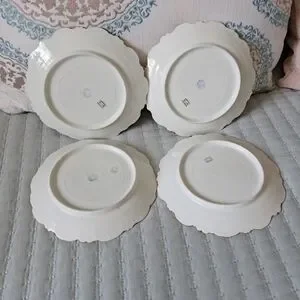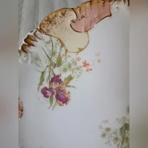 Beautiful Antique 1880s Limoges delicate French Porcelain Dessert Set of 4 Plates in Floral Motif. One with peachy pink highlights and three with blue highlights. In beautiful shape with no chips or cracks on the plates. Amazing condition and still so usable. Delicately hand painted with irises and lilies. A lovely addition to the collection. approximately 7" in diameter