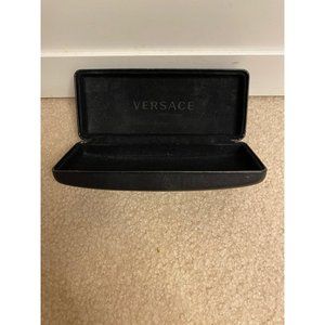 Versace hard eyeglass case in black leather. Gold letters. Velvet interior. A couple minor creases on the back of the case as seen in photos.