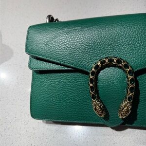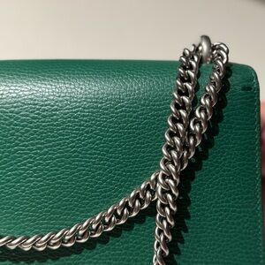 This is an authentic GUCCI Pebbled Calfskin Dionysus Shoulder Bag in Emerald. This stylish bag is crafted of textured calfskin leather in green. This shoulder bag features a silver chain shoulder strap and a textured gold horseshoe closure with lion heads at the end. This opens to a beige fabric interior with a central zipper pocket. This has been worn once. SMALL 6.75x11