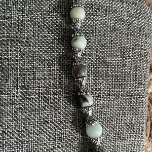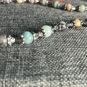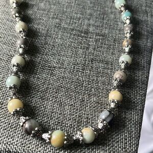 This glass multicolored marbled speckled beaded silver tone toggled necklace measures 26” from end to end. The beads range in color from aquas, golds, browns, creams and all measure 12mm, attached by shiny silver tone metal ornate style hardware.