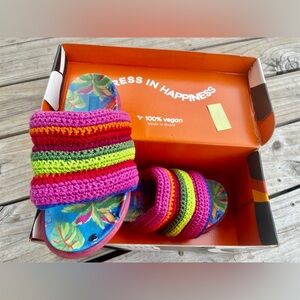 Farm Rio EUC Blue Macaw Crochet Anatomic Platform Slide Sandal with box Size 8