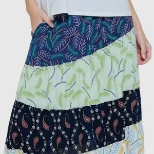 New beautiful patchwork skirt made by yak and yeti comes in size small medium large. Elastic waist long skirt beautiful colors rayon blend these retail for $34 in upscale boutiques. Size small fit size 0 to 6 well. Medium 8 to 12 large extra large 12 to 14.