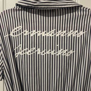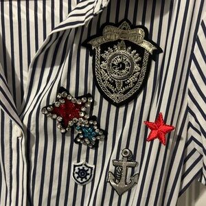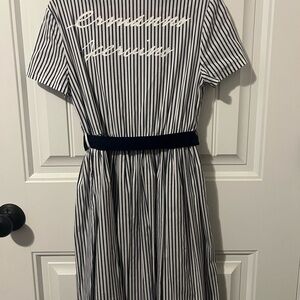 Girls blue and white striped Ermanno Scervino Junior dress with embellishments on left breast and belted waistline. Short-sleeved with script writing across the back. Size 10. Like new condition!