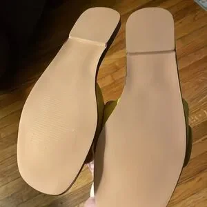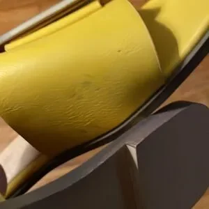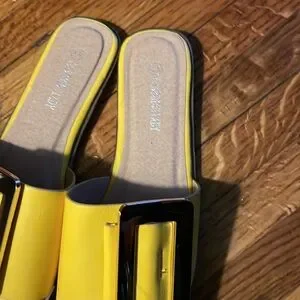 Beautiful yellow slides with gold buckles flat no signs of wear but small mark on inner