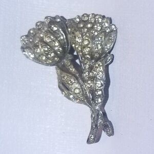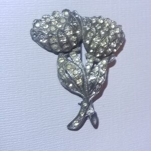 Vintage silvertone brooch of 2 flowers. Has beautiful clear rhinestones, and appears to be a mid-century pot metal brooch.