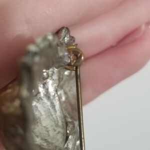 The c clasp looks like the rest of the brooch, but the pin stem that goes into it is a copper-y color, possibly a replacement. The attached end of that has a "V" on it.
