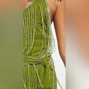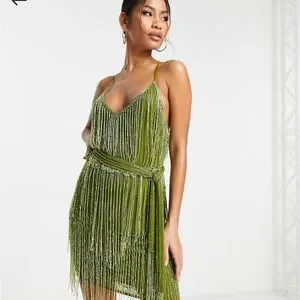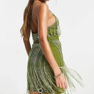 ASOS Design embellished fringe mini dress with tie waist with lime detail