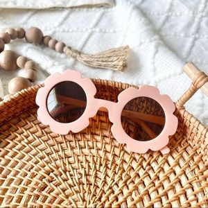 Kid’s Retro Boho Flower Frame Circle Sunglasses. 100% UV protection. Frame width is 4.92”. Size best suited for 2-10. Color is Matte Light Pink with brown lenses.