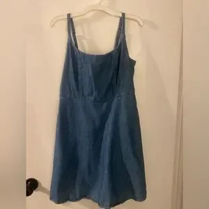 denim style cami dress with scoop neck, adjustable straps, smocked back & seamed waist.