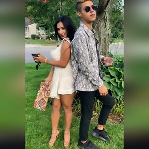 The most darling bustier romper dress. Slightly off-the-shoulder straps, with a slimming waist and zip closure in the back. The bottom is shorts that give the illusion of a flattering & flowy mini-length skirt.