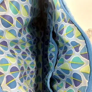 Vera Bradley Blue Crossbody Purse, Purple & Green Leaf Print Inside two slip pockets two out side zip pockets and one slip pocket good pre-owned condition see photos for measurements