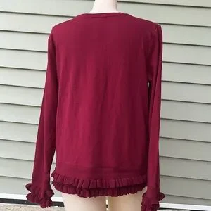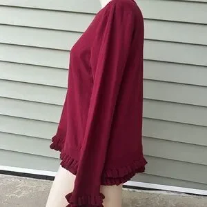 This top is in perfect condition! Brand new with tags. Love the uniqueness of this top. The ruffle sleeves match the ruffle on the bottom of blouse. Very pretty red approximate measurements are 20 inches pit to pit and 24 inches from shoulder to bottom of top. As always, smoke and pet free home. Same-day shipping! Willing to negotiate prices.