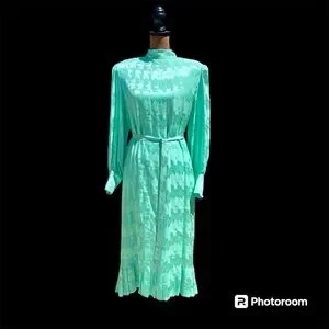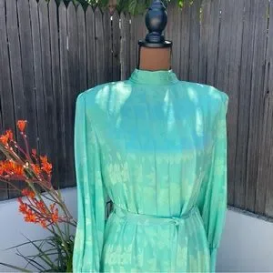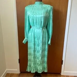 Vintage 80s Adele Simpson 100% Silk Seafoam Green Dress Long Sleeve Pleated 12
