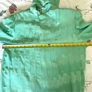 Vintage retro one of a kind unique different event occasion special 1980s 80s 1940s 40s-inspired surf green sea foam green aqua ocean aquatic color mint green pleats flattering mockneck midi calf classic movie star throwback style fashion classy silk quality designer New York authentic