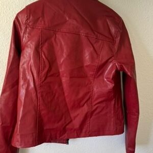 New with tags Motel Olivia Jacket In PU blood red, the Olivia jacket features a regular fit with a silver zip front, long sleeves and a collared neckline with button clasp fastening.