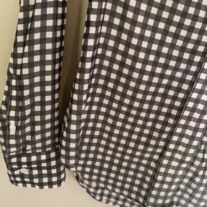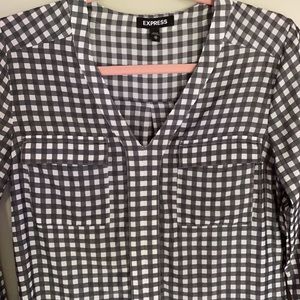 Women’s Express white and grey gingham print collarless City Shirt. Collarless v-neck. Long convertible sleeves with roll tabs. Shirttail hem, flap chest pockets. 60% polyester 40% viscose.