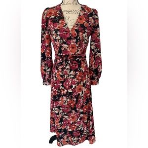 Gorgeous dark floral long sleeve wrap dress with tie front waist for a flattering fit