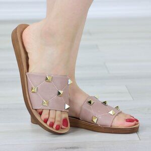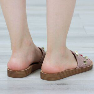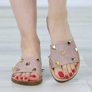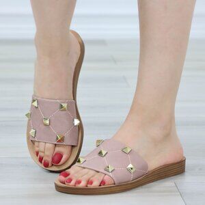 Blush Flat Comfort Flexible Sandal Slip On Sliders Trendy Gold Studs Glittery To