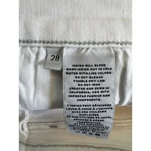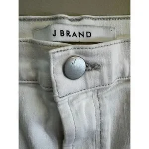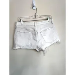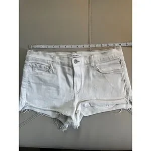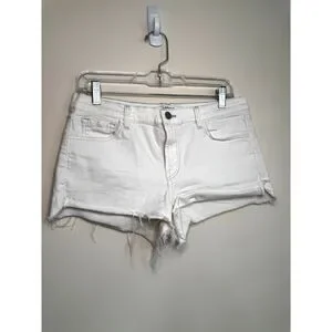 Stretchy off white J brand denim shorts with a contrasting grey stitch throughout. Distressed bottom hem, 5 pockets.