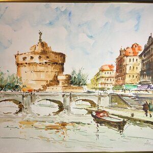 Selling an Original Signed Ponte St Angelo Rome Bridge and Castle Framed Watercolor Painting. It measures 20.25" (h) x 27.25" (w), and it's signed "Adams" on the bottom right corner. It's in Great Condition!