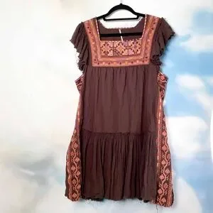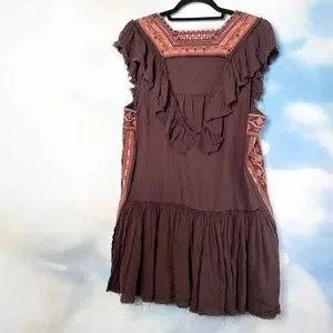 Cute and festive embroidered mini dress from Free People. Perfect for a party, with raw-edged ruffles trimming the sleeves and skirt. Carry it into fall with some tall boots and a jacket. Excellent condition—only worn once. Loose, easy fit that could probably accommodate a size L as well.