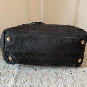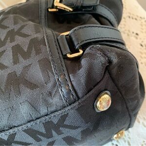 Michael Kors Gansevoort Tote Bag. Black on Black. Gorgeous monogram canvas, side caged leather strap detail, gold toned hardware, one interior compartment with one zipper pocket and four slip pockets, top magnetic closure, three outside pockets, two short shoulder straps and removable long shoulder strap. Gently used, good condition, one front snag, some corner and strap wear, see all pictures for details and description.