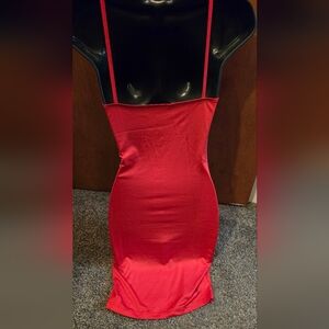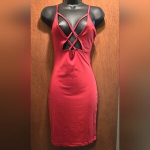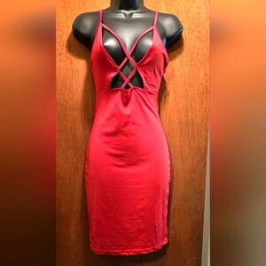 This is a gorgeous red dress with sexy cutouts in the front. This is a bodycon dress with tons of sex appeal. There are no designer tags, and the size tag states it is a size XL, but the measurements confirm that it is more in line with a small or extra small. The approximate unstretched measurements;