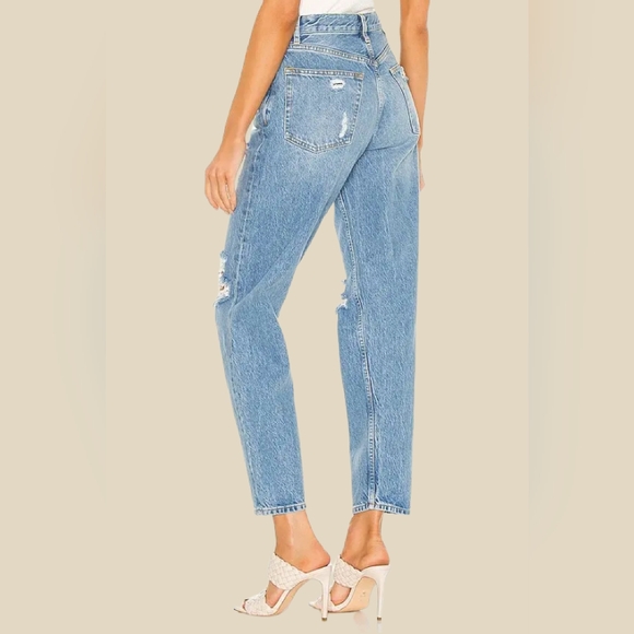 Epitomizing the 90's. Our Toby jean in Unfaithfully Yours resembles your favorite vintage high-waisted jeans with a relaxed tapered fit and Boyish flair. These sustainable jeans come in a medium blue eco-wash and destruction. Includes GRS-certified recycled cotton and Refibra‚Ñ¢ technology