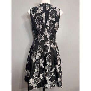 Material: 100% polyester Lining: 100% polyester Machine wash Black satin dress with silver floral jacquard print