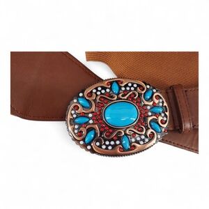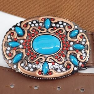 Southwestern Style Turquoise Blue Coral Red Copper Belt Buckle Brown Stretch XL