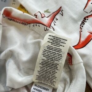 Features a cream base with dinosaurs in green, blue, yellow and red.