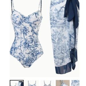 NWT Size 16 to 18 (xxl) on it. Cute one piece corset style with boning in blue and white toil with matching wrap. Real cute just too big for me.. new with protector on gusett. Never worn or tried on..wat too big for me.