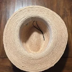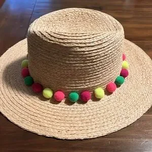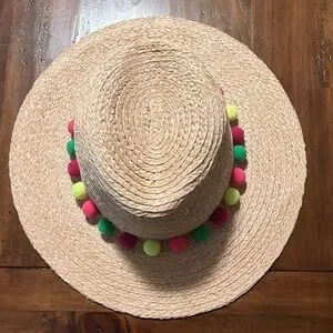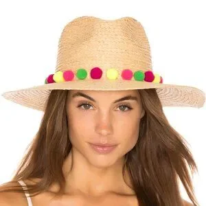 100% raffia straw. Dry clean only. Pom pom trim. Interior adjustable band.