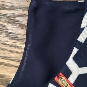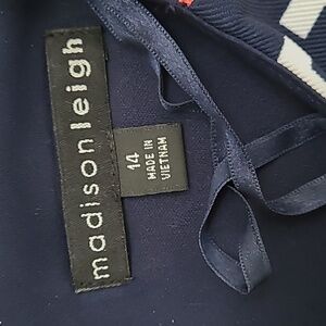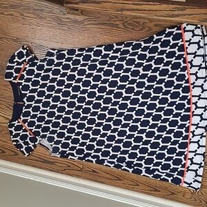 Previously owned and gently worn. Freshly cleaned. Madison Leigh geometric print shift dress. Black and white print with orange piping near the bottom. Cap sleeve. Zipper detail on the shoulder. Slight padded shoulder.