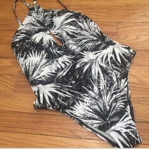 Black and white palm print with gold hardware. Open Strappy back! Cheeky bottoms. Keyhole front with high Neck and removable padding