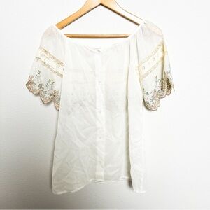 Vtg 70s floral embroidered scallop eyelet lace Oaxacan blouse top peasant boho