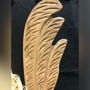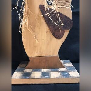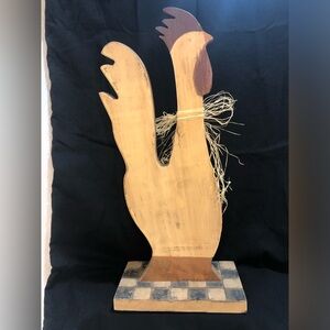 Add some farmhouse charm to your home with this wooden rooster with checkerboard base and metal heart for the wing. Very beautifully carved feathers and a raffia bow. 16” tall and 7” wide at the base