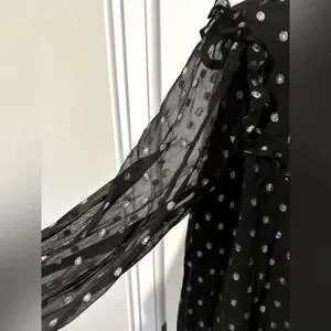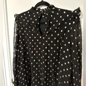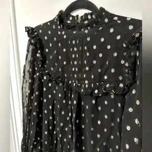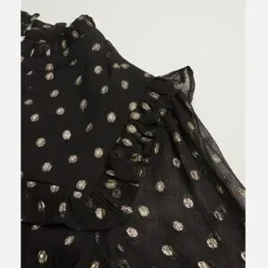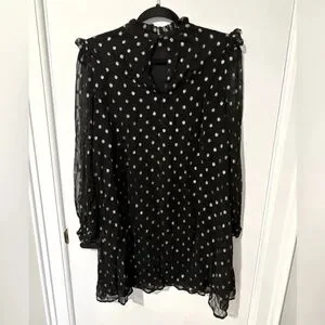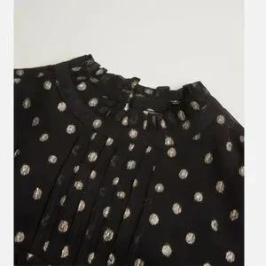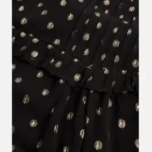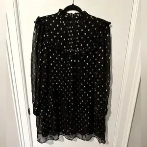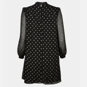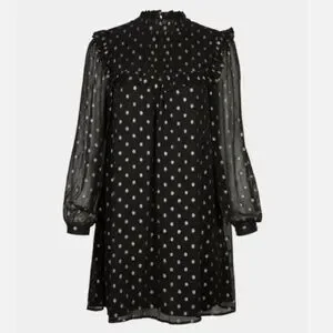 In a flowing A-line fit with soft pleating and frilled detailing, this long sleeved mini dress is in a sheer black fabric with a metallic gold-toned foiled spot print for a statement look. Featuring an elegant high neckline with a button fastening in the back neck, this dress is completed with gentle ruching and fitted cuffs.