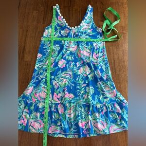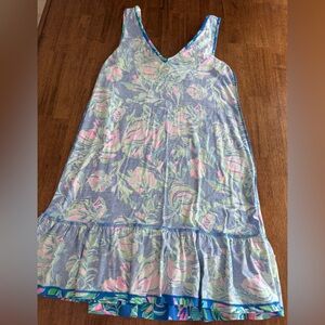 Gently worn 2x, Lilly Pulitzer Camilla Dress Size Small, print is Blue Flare Fancy Fins. Very slight wear/piling under arms.
