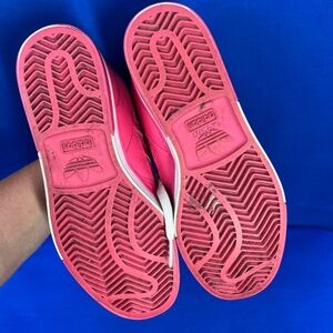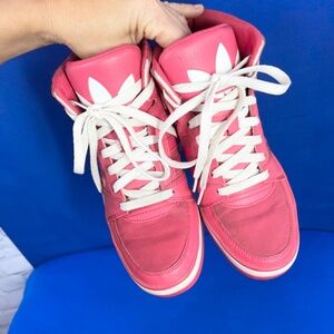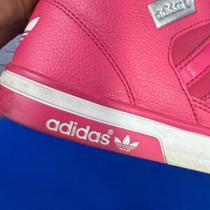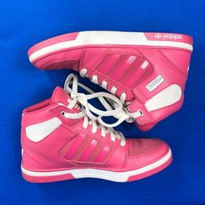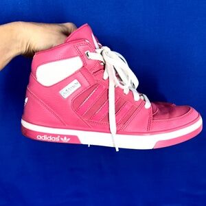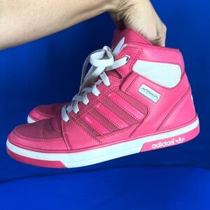 |•ADIDAS•| Ortholite Retro Bubble Gum Barbie Pink High Top Sneakers. How fun are these?!~? Adidas in pink with white. I so want to keep, but I don't get to keep my finds, so! They are all yours... :) Pink with white, high tops. ortholite. Good condition. Size 6. I have tried them on myself, and I generally wear a 7 - 7 1/2 in sneakers, and I could wear these without socks and they're just a bit too tight with a medium sock so I would say they are a to 6 to 6 1/2 at least.