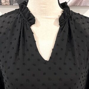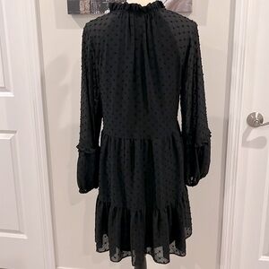 Feminine long sleeve ruffle dress with clip dot textured fabric. Body of dress is fully lined with sheer sleeves.