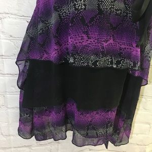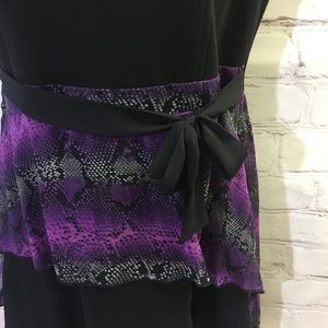 This is a special edition Dsigned by Disney purple & black snakeskin fabric print dress. It features a cute front self tie bow, rear silver metal zipper and has lace capped sleeves. Gently preowned with no flaws.