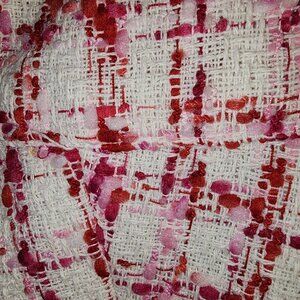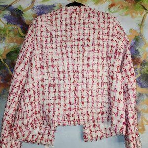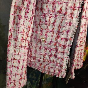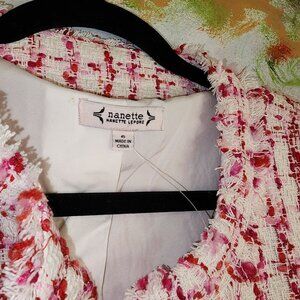 This Nanette Lepore tweed jacket, with its exquisite pearl button accents and playful fringe details, is a statement piece for any wardrobe. Its vibrant red and white hues add a touch of elegance and charm, making it a standout choice for those who appreciate timeless fashion.