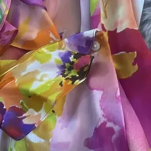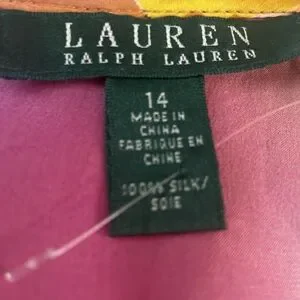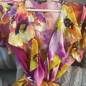 This is a gorgeous top by Loren Ralph Lauren size 14, 100% silk . floral soft is silkiest top with a very long belt ruffled front short sleeve . BEAUTIFUL COLORS .