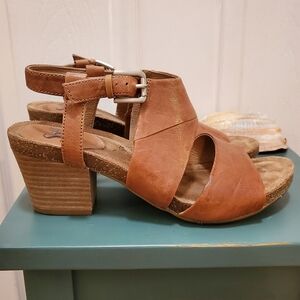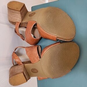 Softt KHCT-J19 Open toe sandal, size 8.5M, caramel color, 2.75-inch block heel, genuine leather upper and lining, buckle closure on ankle strap, grippy rubber sole. From Coldwater Creek. Gently worn twice. Good as new.