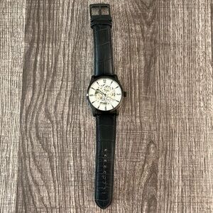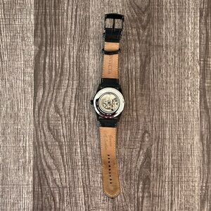 Watch face is black stainless steel with open gear design. The hands of the watch are white outlined in black. The watch band is genuine calf leather and has an indent from being worn also has stains on the back. Watch features flame-fusion crystal.