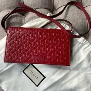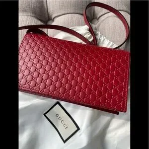 This is an authentic GUCCI Microguccissima Crossbody Wallet in Red. This chic and compact wallet is superbly crafted of Guccissima calfskin leather in red and comes with an optional adjustable shoulder strap. The flap unsnaps to a red leather interior with billfolds, credit card slots, and a zipper compartment.