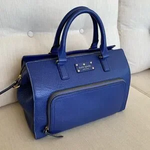 GENTLY USED AND LOVED, this Kate Spade New York pebble grain leather satchel is a gorgeous shade of lapis lazuli blue. It has never seen a drop of rain. Zippered front pocket. Two interior pockets plus one zippered, with the traditional Kate Spade lining. Use as a handbag or attach the shoulder strap for hands-free style. There are some signs of everyday wear on some of the edges (see photos) but they don’t detract from the beauty of this bag. You could touch them up if you had the right color Sharpie and no one but you would know!