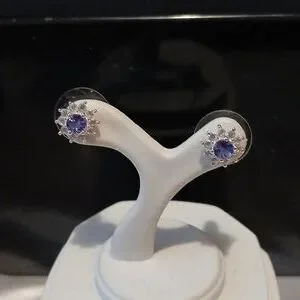Tanzanite and white Zircon, not Zirconia, (Zirconia is man made) Zircon is a real gemstone from the earth which comes in different colors. floral design stud earrings 1.10ctw. these beautiful earrings are just stunning and just gorgeous. from any age they'll love it or you will love these! these will be your go to earrings. they closed the only mine in Tanzania. which if you do find them they will be very expensive. thank you! never worn! new without tags. 925 sterling silver. by the next 15 to 20 years prices are going to be very expensive to purchase. I bought my son a 2ct ring in quad A grade for his engagement ring, and he was 7 at the time now he's going to be 14, by the time he gets married that ring will be worth thousands, not to mention Tiffany's in New York were the 1st store to sell tanzanite. in the 60's
